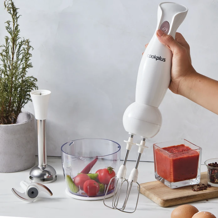ست مخلوطکن Cookplus Midimix با موتور قدرتمند ۵۵۰ واتی و قطعات فولادی همزن، مخلوطهایی مانند خمیر کیک، خامه و غذای کودک را آماده میکند، در حالی که تیغههای فولادی دو طرفه آن به شما امکان خرد کردن پیاز، سبزیجات، میوه و گوشت را میدهد. این مخلوطکن دارای یک کاسه ۷۰۰ میلیلیتری است که به شما امکان میدهد مقادیر زیادی از مخلوطها را به طور همزمان آماده کنید. بدنه و دکمه ارگونومیک آن، استفاده از آن را آسان میکند. تیغههای فولادی ضد زنگ آن قابل شستشو هستند و لوازم جانبی آن به راحتی قابل جدا شدن هستند و در زمان و انرژی شما صرفهجویی میکنند.