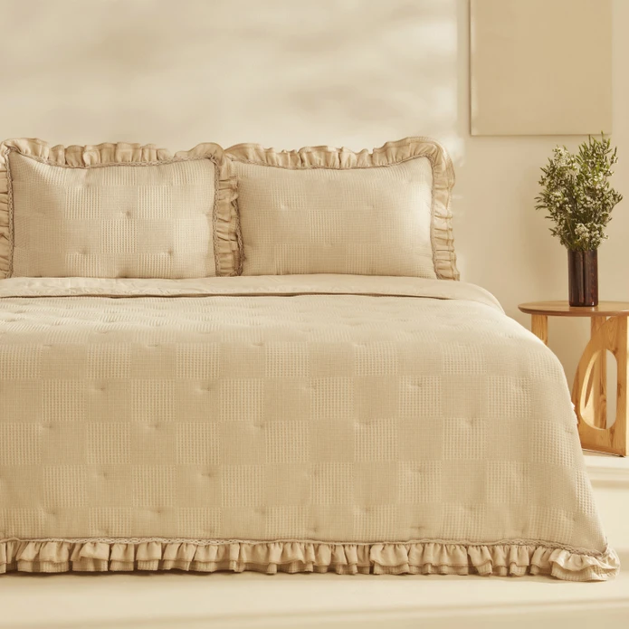 سرویس خواب دو نفره/راحتی فنری ۱۰۰٪ پنبه‌ای پریوس از مجموعه سفید کاراجا هوم، رنگ بژ چین‌دار